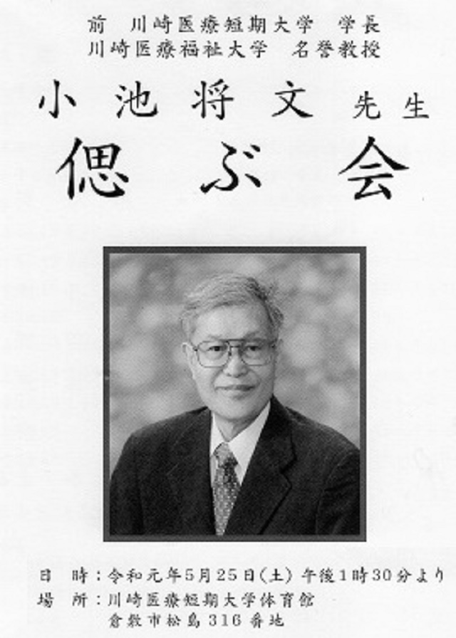 「小池将文先生を偲ぶ会」が2019年5月25日(土)13:30〜川崎医療短期大学で執り行われ、出席してまいりました。350名余(推定)の参列者が訪れ元岡山県知事石井正弘氏の弔辞を始めとして、多くの著名人の弔辞が続き盛大かつ荘厳に執り行われました。あらためて彼の功績に敬服いたしました。謹んでご冥福をお祈りいたします 合掌。福田富男